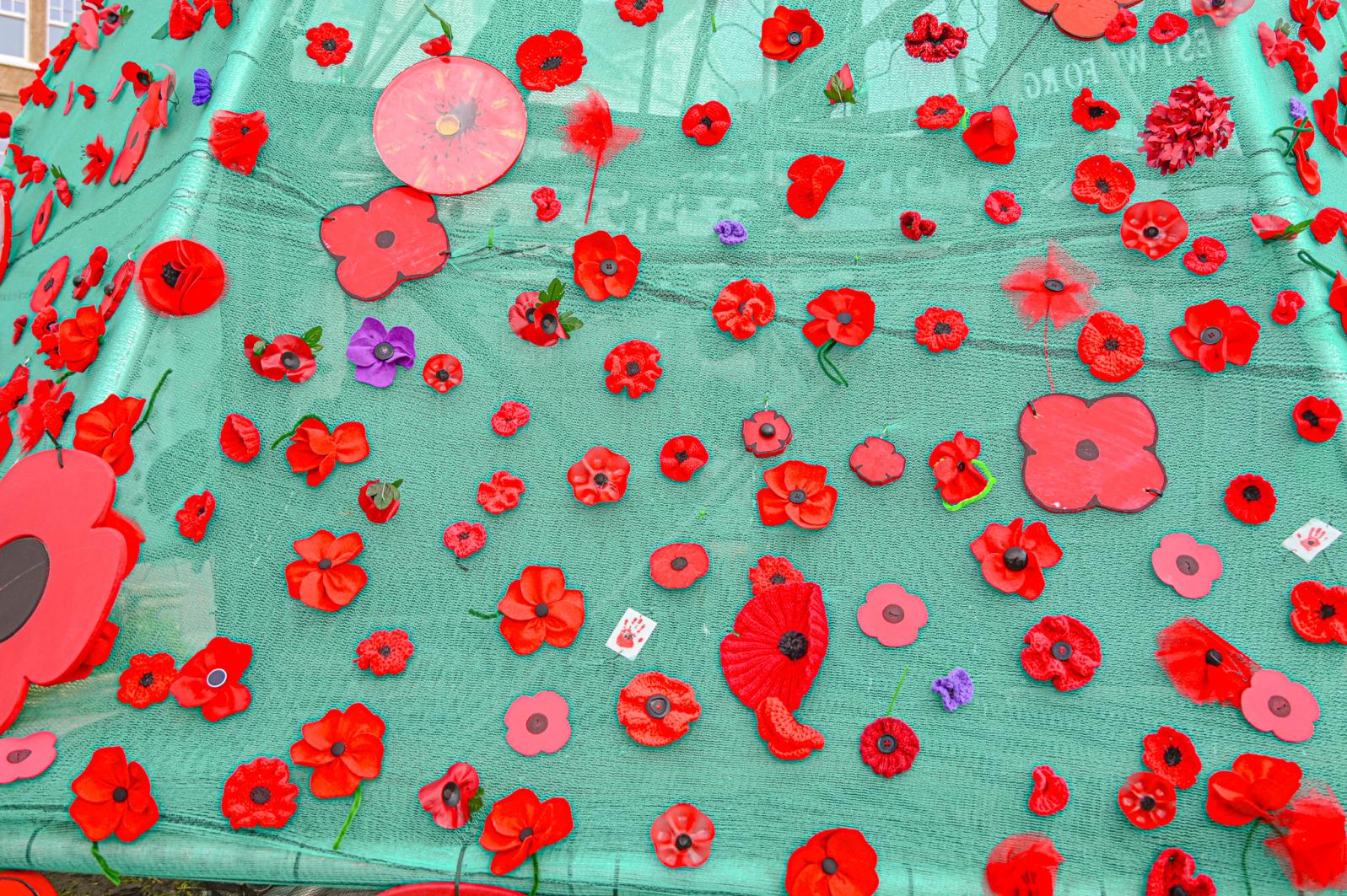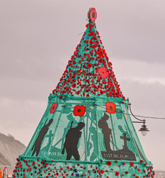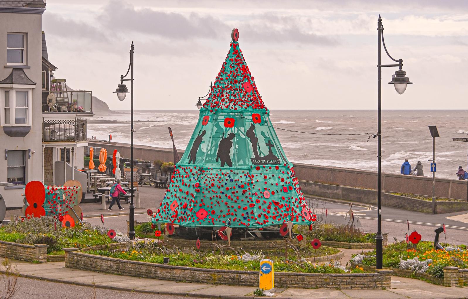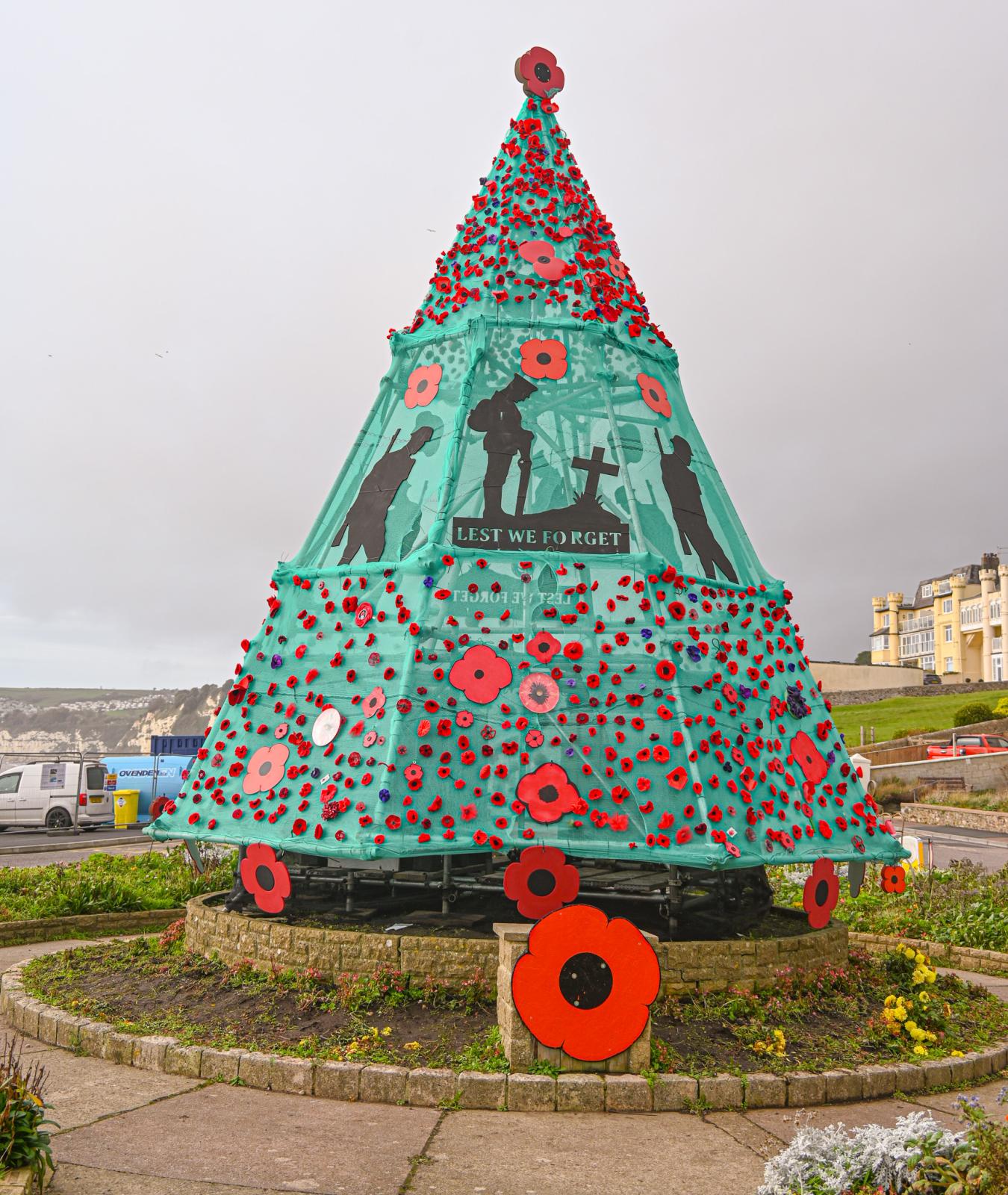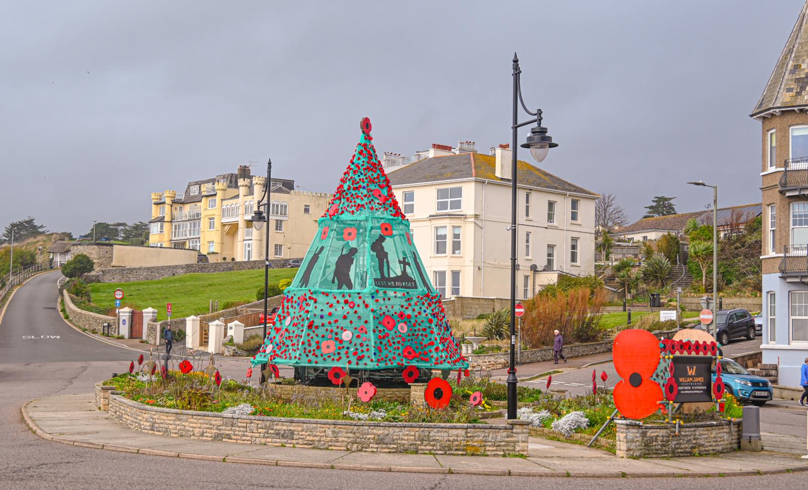 Situated in the middle of Marine Place Roundabout, a striking cone-shaped structure has been lovingly adorned with handmade poppies created by local residents — a touching symbol of community spirit and remembrance.