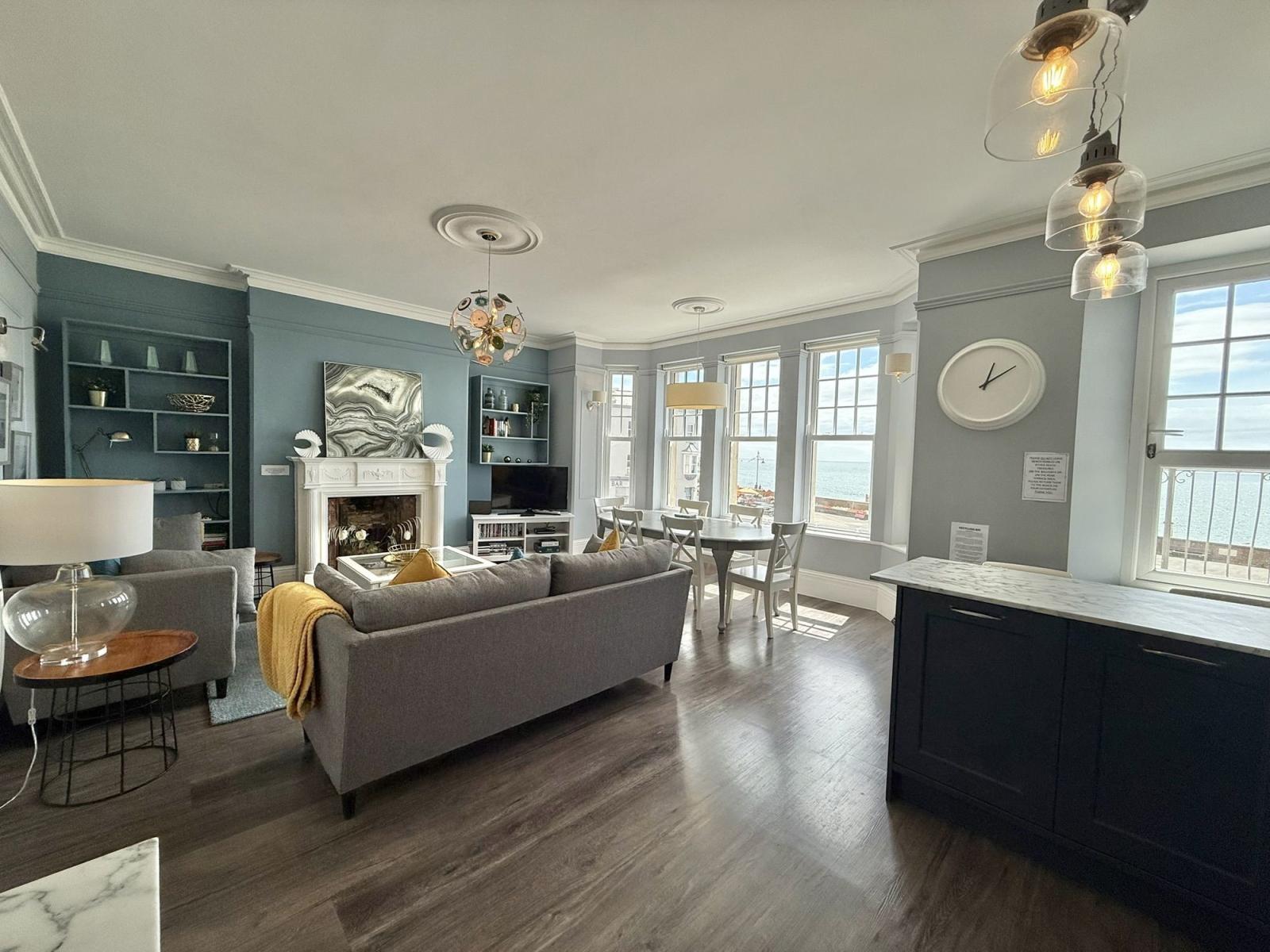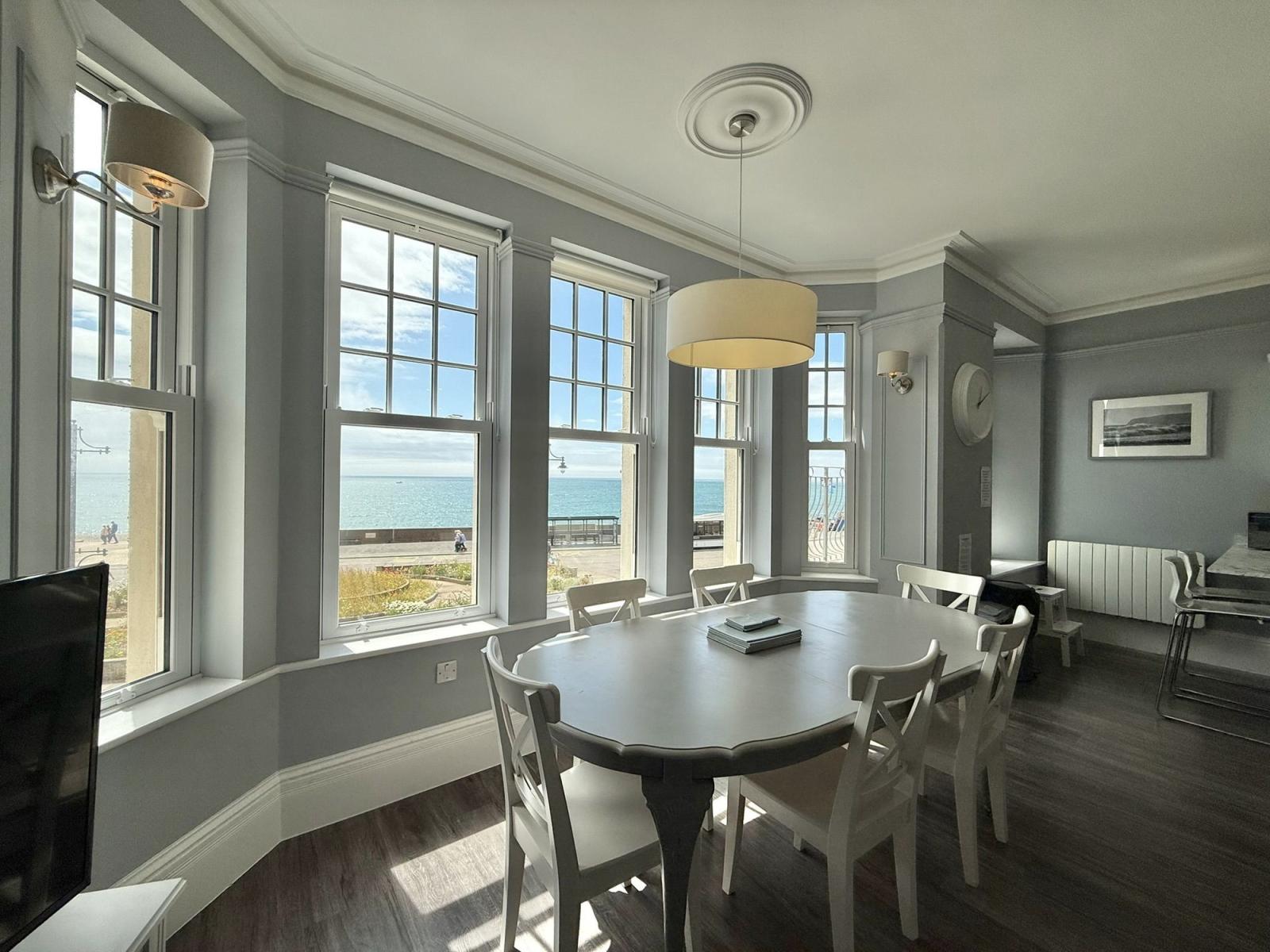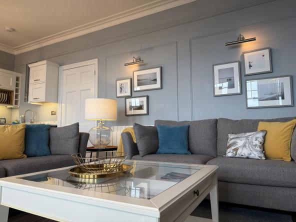 The Eastleigh is a contemporary first floor apartment overlooking Seaton seafront with stunning sea views from the open-plan lounge, dining, and balcony area. The stylish flat can accommodate up to 6 guests in 3 bedrooms - the master bedroom has a king size bed and an ensuite shower room, there is a double bedroom and a twin room with two single beds.